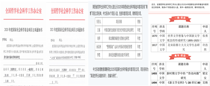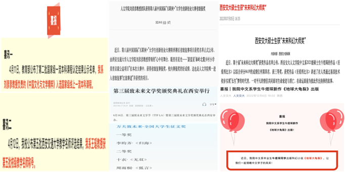 中文系連續(xù)三年本科畢業(yè)論文(孫晨晨、許墨芃菲、淳若陽)被評為校級優(yōu)秀畢業(yè)論文,2名研究生獲得校級優(yōu)秀畢業(yè)論文(戴思宇、陳天豐)。指導(dǎo)學(xué)生獲得第八屆中國國際互聯(lián)網(wǎng)+大學(xué)生創(chuàng)新創(chuàng)業(yè)大賽省級銀獎,西安交通大學(xué)金獎、銀獎等多個獎項,1名學(xué)生獲得“未來科幻大師獎”。本科生李昀齊在第三屆“致未來文學(xué)獎”中獲得“大學(xué)生長安主題征文”一等獎。牛煜琛(指導(dǎo)教師王瑤)的“國家科普科幻IP‘地球大龜裂’孵化項目”入選陜西省第七屆研究生創(chuàng)新成果展高質(zhì)量成果。